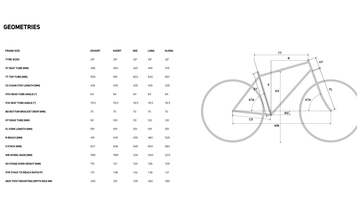 XSHORT: ход подседельного штыря 150 мм - SHORT/MID: ход подседельного штыря 170 мм - LONG: ход подседельного штыря 200 мм - XLONG: ход подседельного штыря 230 мм