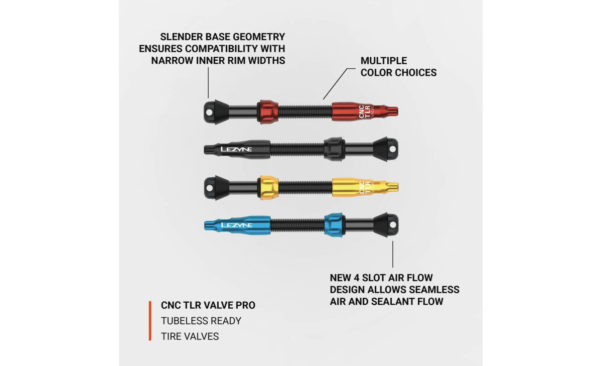 Ніпелі безкамерні Lezyne CNC TLR VALVE PRO– це високоточні безкамерні вентилі, створені для використання на шосейних, gravel та гірських велосипедах. Виготовлені з легкого та міцногоCNC-обробленого алюмінію, ці вентилі мають сучасний вигляд і забезпечують надійну продуктивність. Чотирислотова система високого потоку дозволяє повітрю та герметику вільно проходити, навіть при використанні з вставками для шин. Завдяки вузькій геометрії основи, вентилі сумісні з різною шириною внутрішніх ободів.
